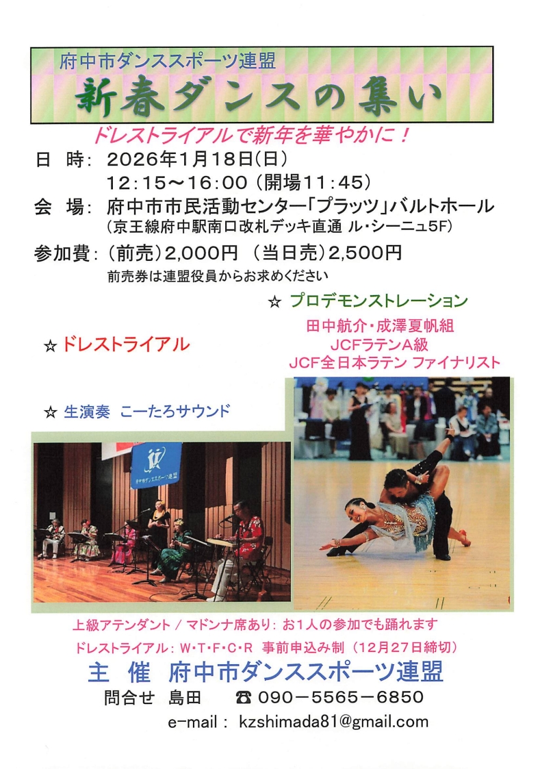 社交ダンス・ダンススポーツ振興の一環としてパーティー情報をご案内していきます。 ルミエール府中、ル・シーニュでのパーティーの他サークル主催のパーティー等も掲載いたします。 府中市内のダンスパーティーの情報をお寄せください。 情報連絡先 島村光征 090-8819-3868 2026年新春ダンスの集い 2025年6月 社交ダンスの集い 2025年新春ダンスの集い 2024年社交ダンスの集い